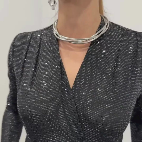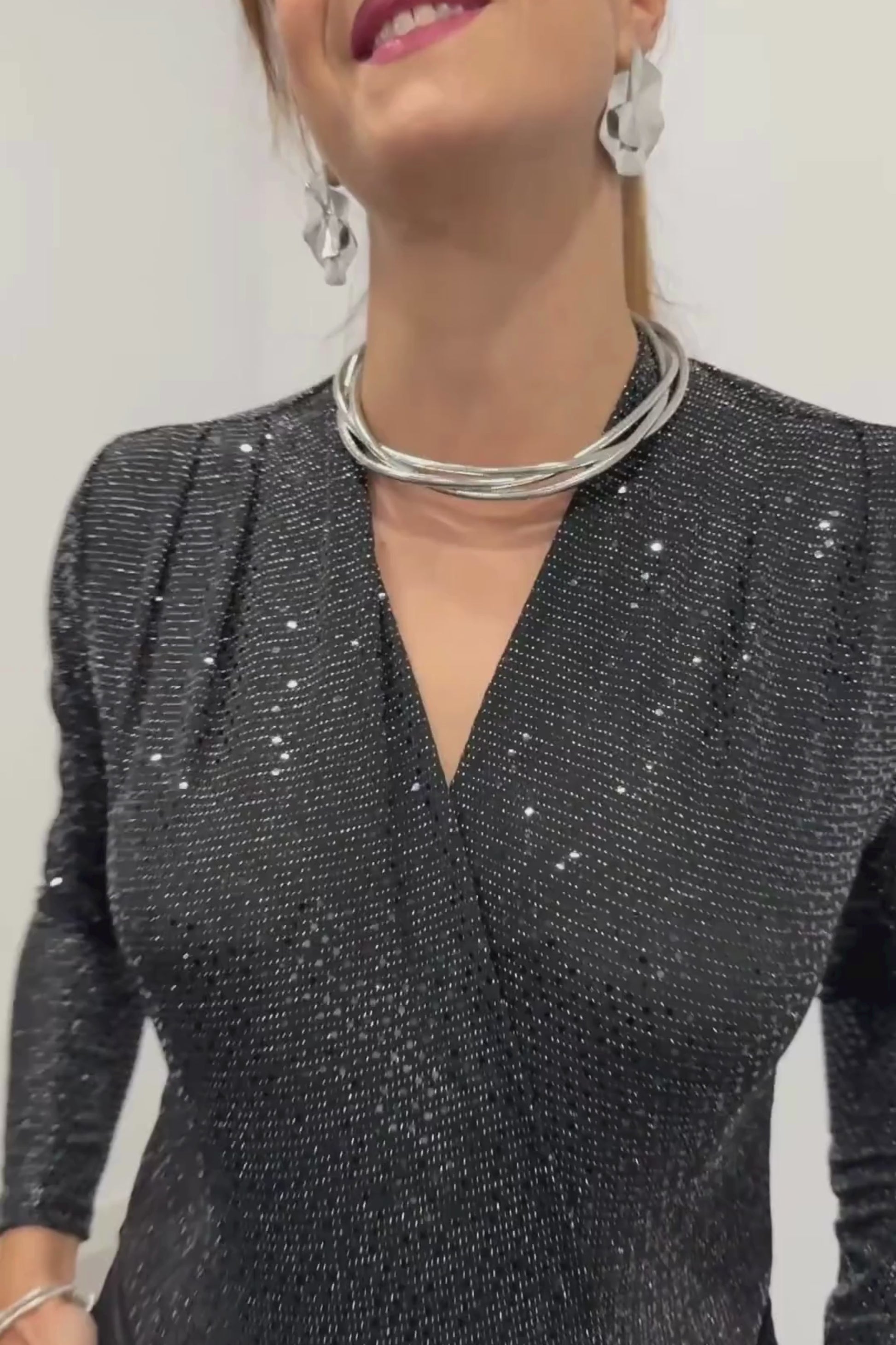 Body negro con brillo, elegante y sofisticado, diseñado con un sutil efecto brillante que aporta un toque de glamour. Su escote cruzado realza la figura de manera delicada, ideal para looks de noche o eventos especiales. Comodidad y estilo en una sola pieza.