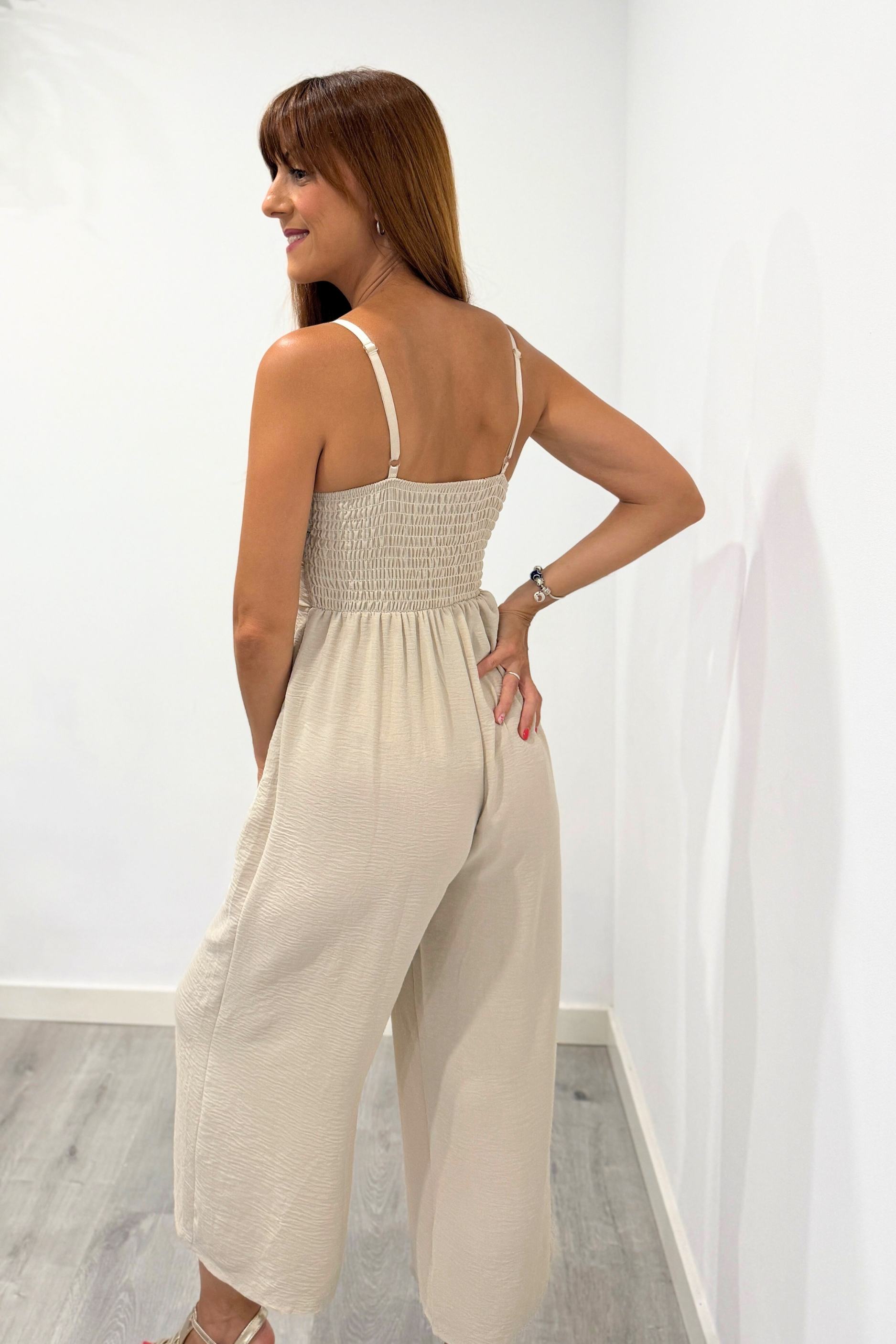Luce un look fresco y moderno con este mono cropped, diseñado para combinar estilo y comodidad. Destaca por su lazada en el pecho con cascos incorporados, que aporta sujeción y un toque femenino. La espalda con panel de abeja garantiza un ajuste perfecto, mientras que sus tirantes elásticos y regulables se adaptan a tu cuerpo. Su pantalón de pata ancha añade movimiento y elegancia, ideal para salidas casuales o eventos especiales.